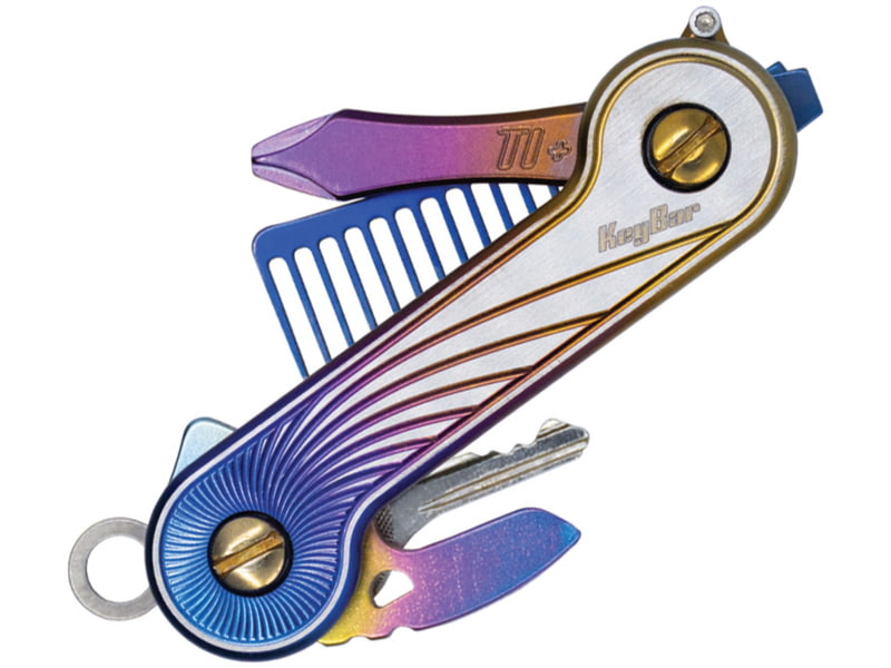 KeyBar Titanium Rad. 5" overall. Spectrum anodized titanium construction. Tools include: Pocket clip and Key fob. Screws included (to hold 4 8 or 12 keys). Load keys in preferred order. O-rings keep keys snug and allow for adjustment of tension....  Read more
