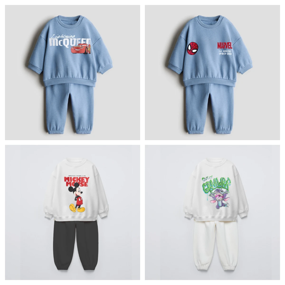 Blue And White Series Hoodie Set Featuring Popular Anime Characters Such As McQueen Spider Man Mickey And Stitch Printed 2 PCS