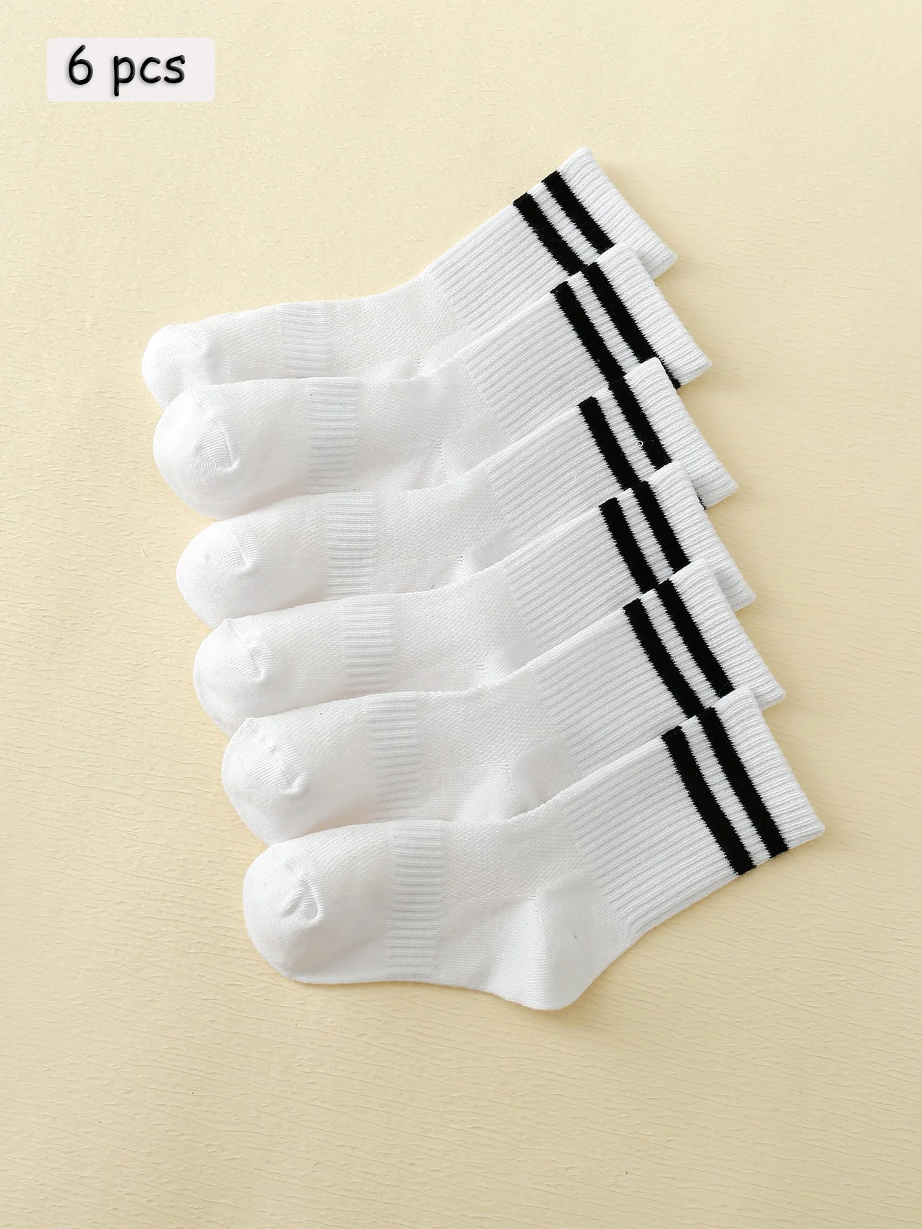 6 Pairs of Children's Mid Length Stockings Set in Pure Black And White With Parallel Bars Popular and versatile Sweat Absorption