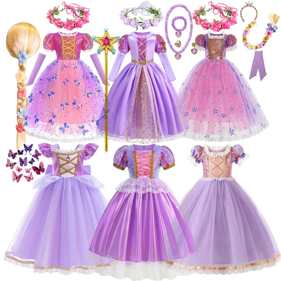Disney Rapunzel Short Sleeve Purple Puffy Dress + Accessories Girls Cosplay Rapunzel Summer Casual Dress Birthday Party Gift