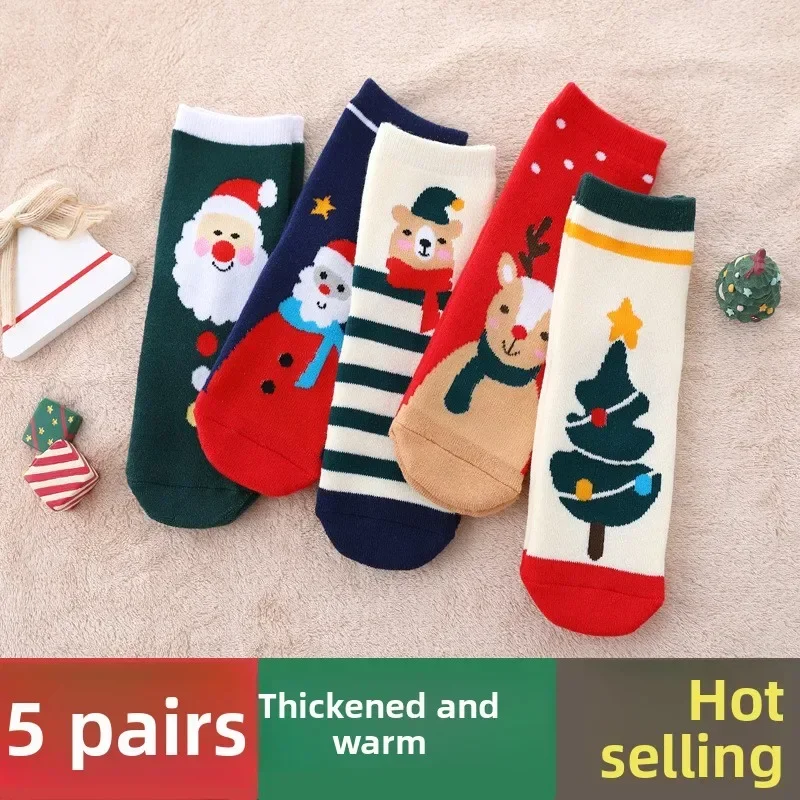 Christmas New Year 5 Pairs Thick Terry Thermal Socks for Kids Boys Girls Winter Festive Cartoon Red Warm Unisex Socks