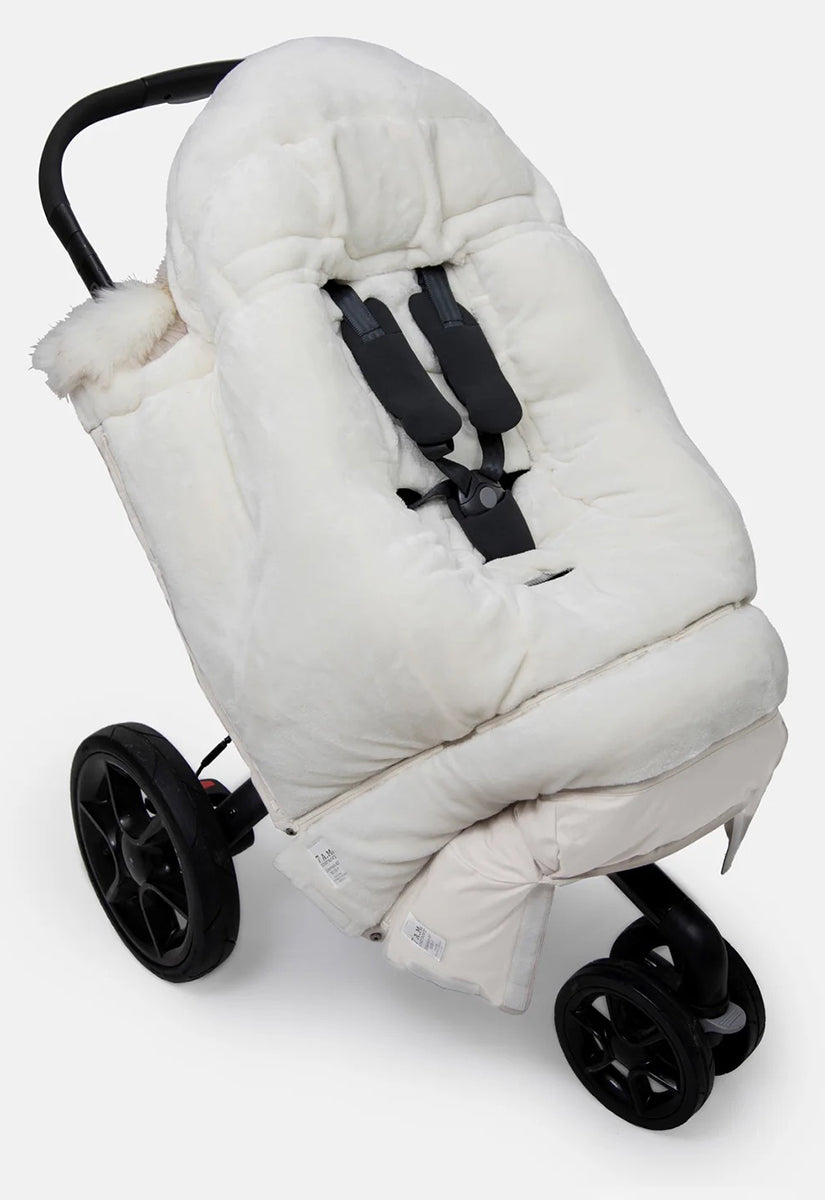 Thanks to its sherpa lining, the footmuff offers optimal protection. In very cold weather, the fleece hood with drawstring keeps your baby even warmer. To adapt to all seasons, the hood is reversible and the upper part of the footmuff is fully...
