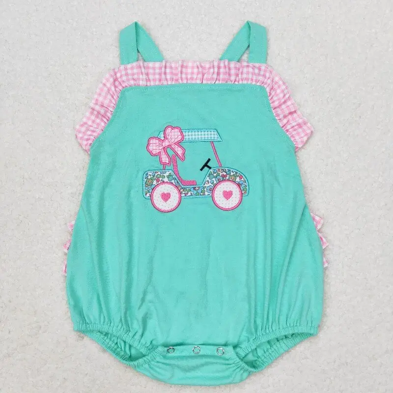 New rts baby girls spring rompers wholesale boutique embroidered golf pattern girls blue romper