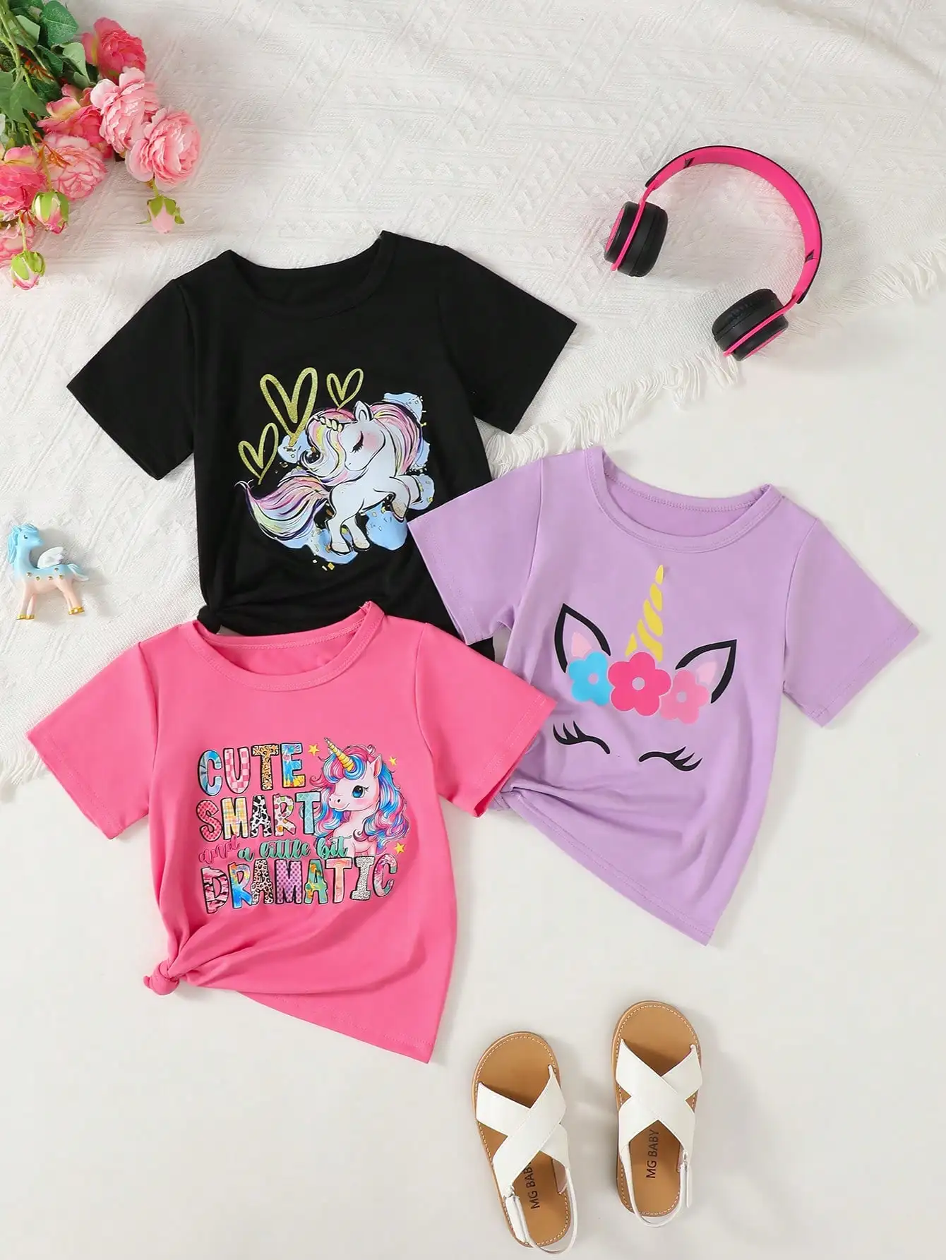 3pcs Girls' Summer Unicorn & Letter Print T-Shirts