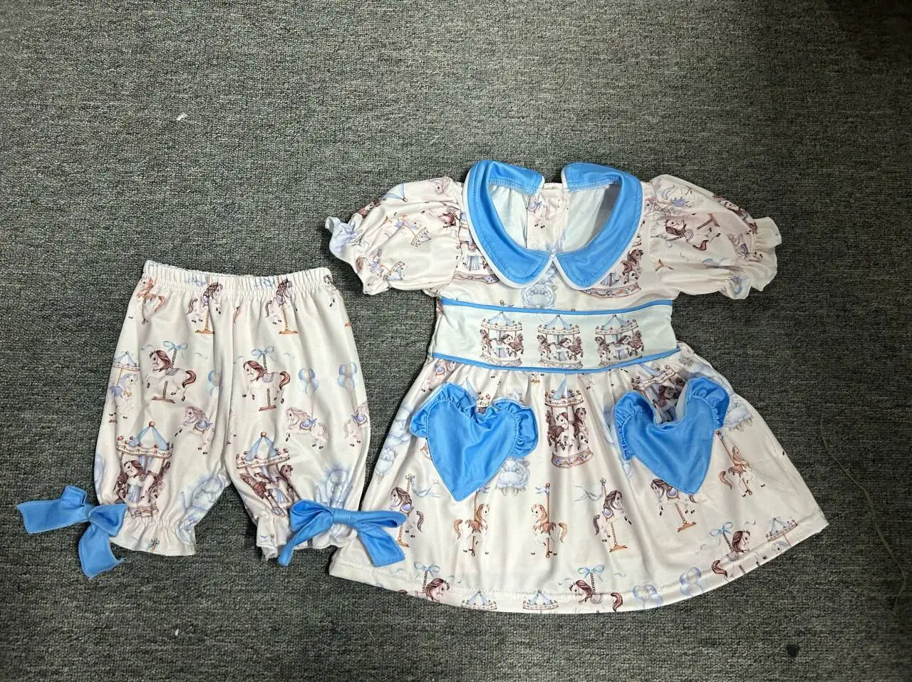 Hot selling boutique children's suit short sleeve elastic carousel print heart pocket trousers girls boys pajamas