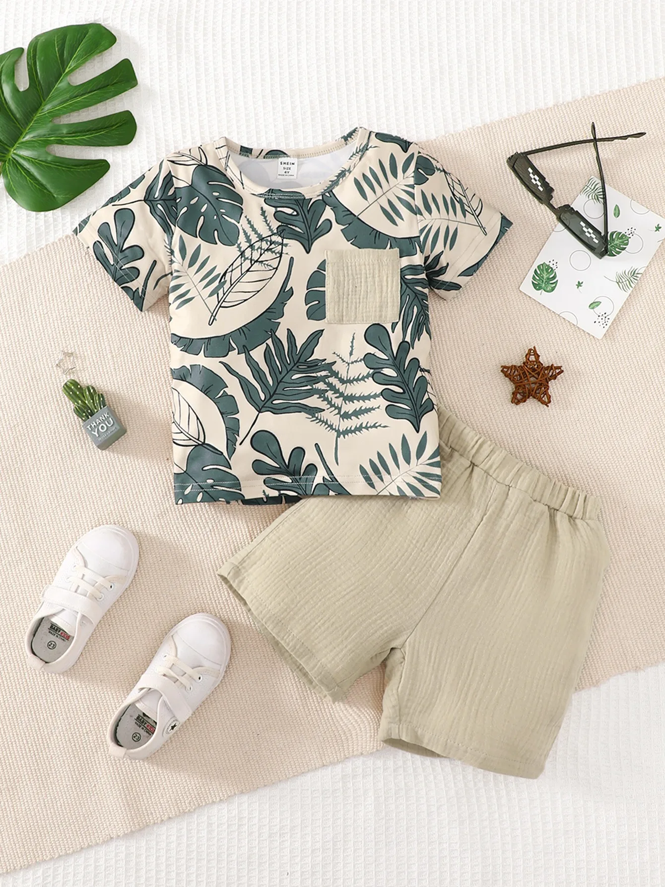 2PCS Kid Boy Clothes Set Short Sleeves Leaf Print Pocket Style T-shirt+Shorts Summer Casual Outfit For Child Boy 4-7 Years