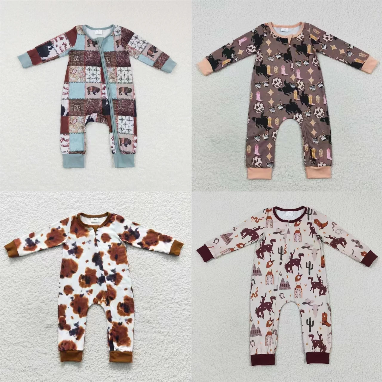 Wholesale Toddler Baby Boy Romper Western Clothes Kid One-piece Newborn Coverall Bodysuit Zipper Long Sleeves Cow Print Jumpsuit