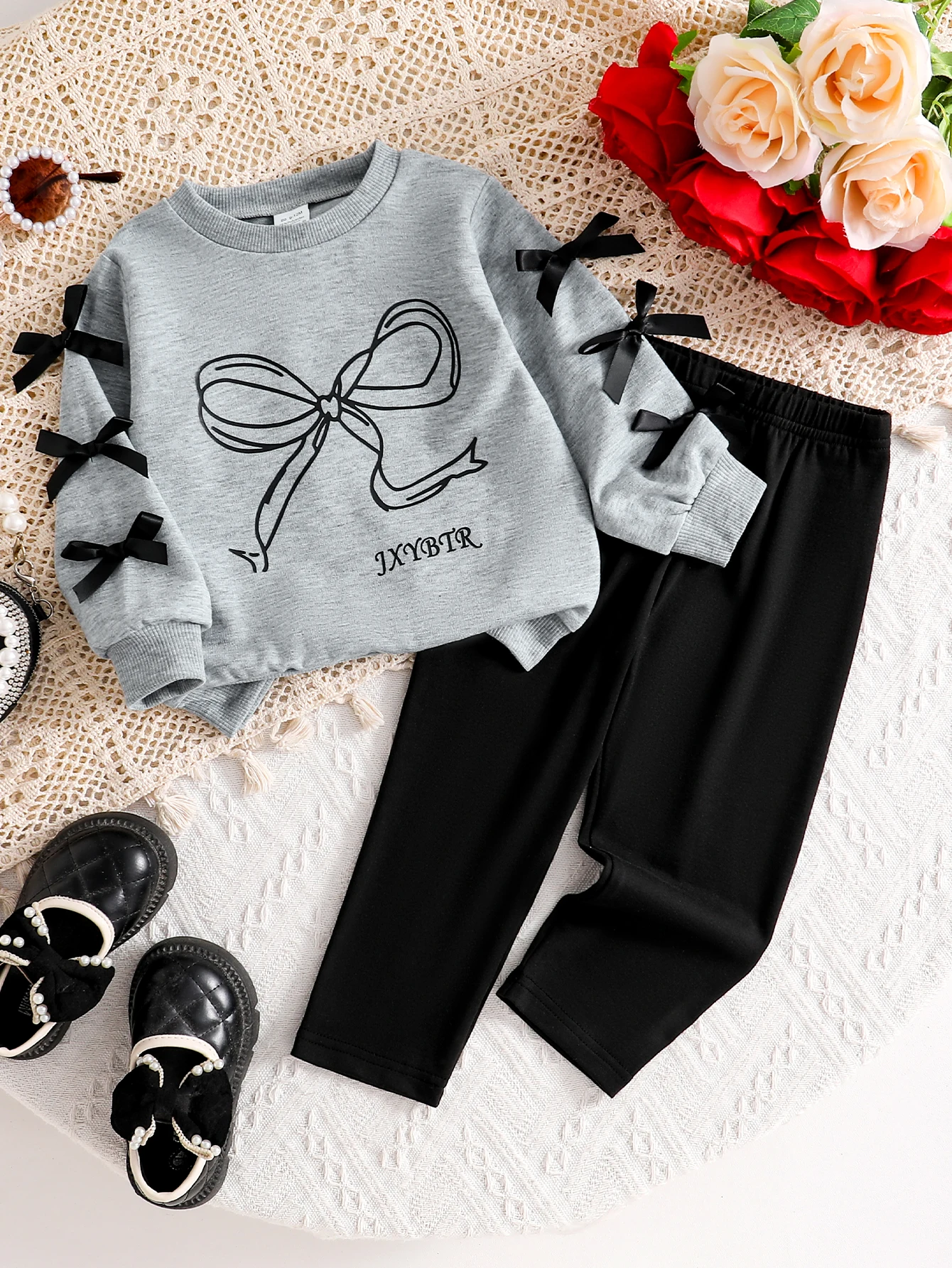2-Piece Set for Toddler Girls: Cute Bow Print Gray Sweatshirt + Black Pants, Comfortable Outfit for Spring, Autumn, and Winter. Baby Girl Casual Sports Pullover, Newborn Children's Long-Sleeve Bow