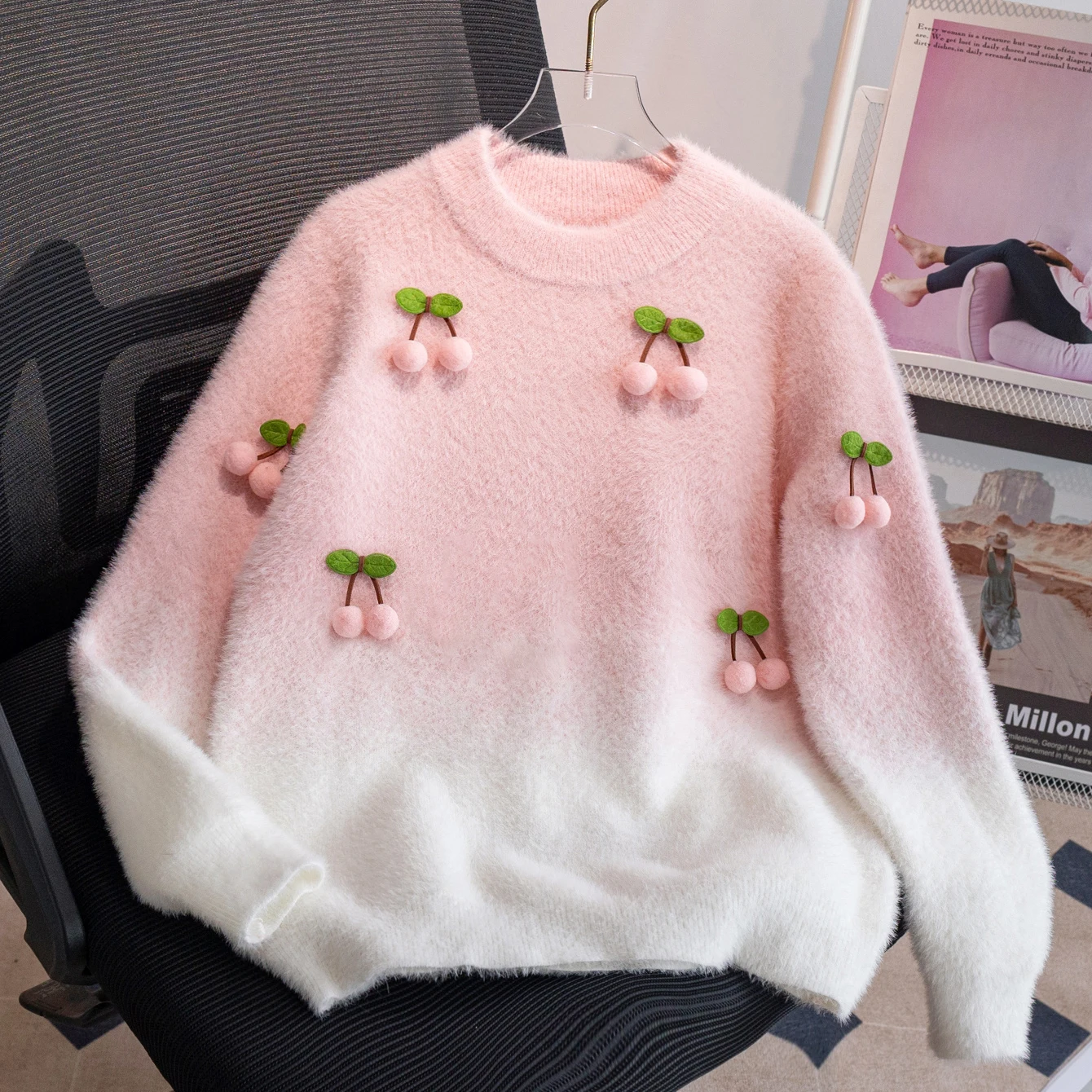 Girl's cute style gradient cherry sweater knitted pullover suitable for daily vacation in spring, autumn, and winter