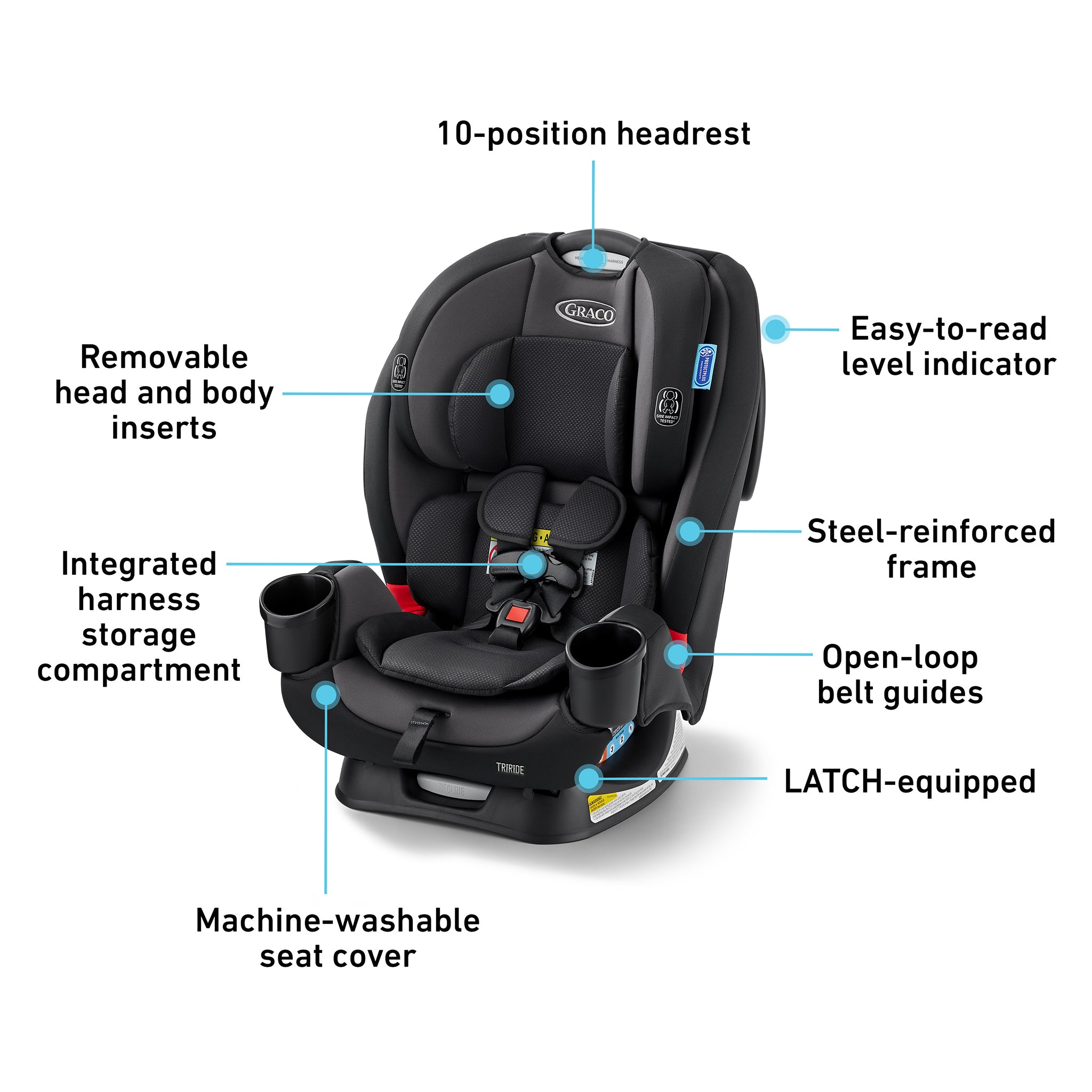 The Graco TriRide 3-in-1 Car Seat helps to keep your little one safe from baby to big kid, through 3 modes of use: rear-facing harness (5-40 lb), forward-facing harness (26.5-65 lb), and highback booster (40-100 lb). The No-Rethread Simply Safe...  Read more