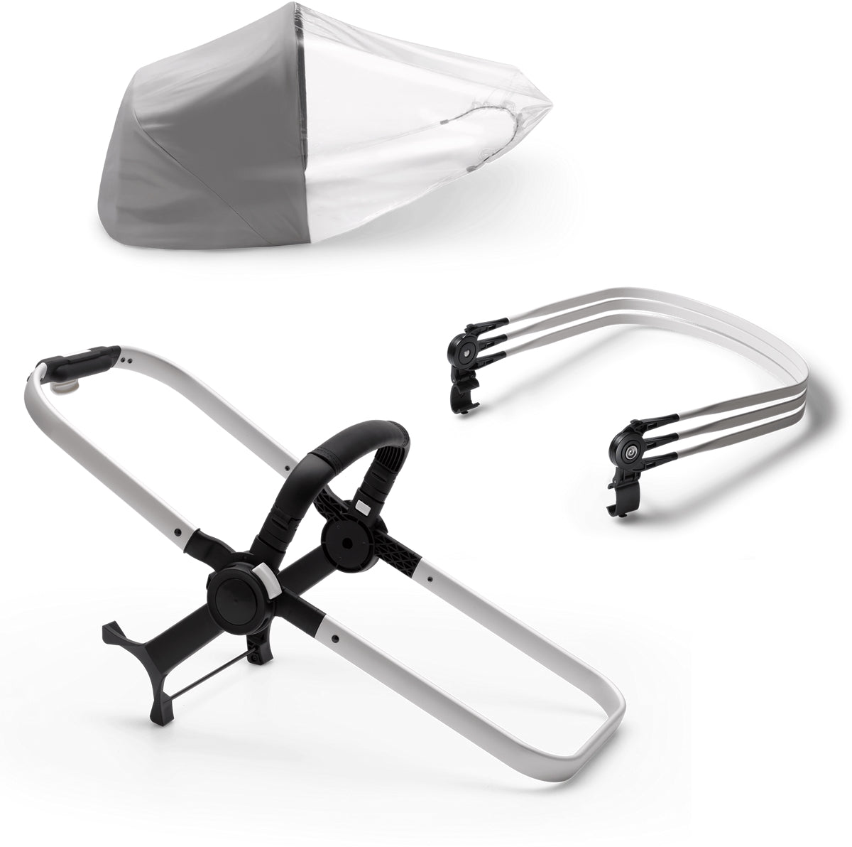 This item contains the bugaboo fox2 chassis including wheels, seat/bassinet frame, rotating carry handle, canopy wires, canopy clamps, seat hardware, comfort harness, foot rest, bassinet bottom and bassinet stiffners, rain cover, grips and wheel caps.  Read more