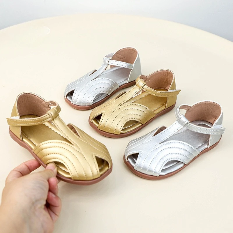 Brand Girl Sandals 2025 Summer New Gold Kid Leather Shoe Fashion Princess Shoe Allmatch Boy Sandals Trend Roman Shoe Kids Shoes