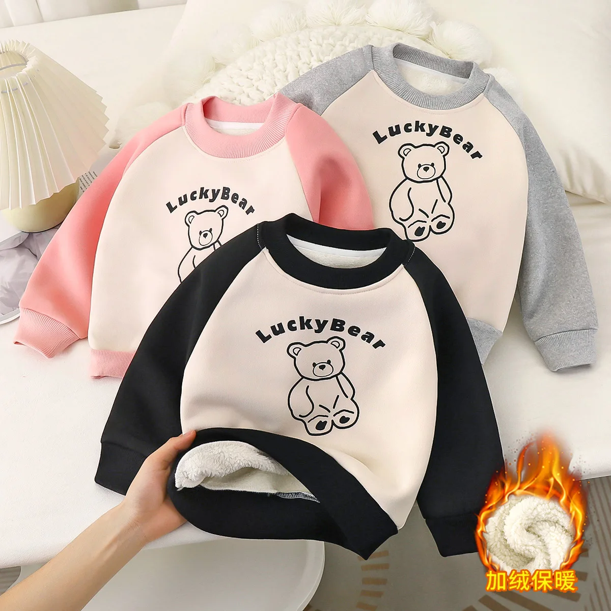 Children's Thick Sweatshirts Boys Girls Plus Velvet Warm Pullover Autumn Winter Tops with Bottom Kids Clothes Long Sleeve Coats