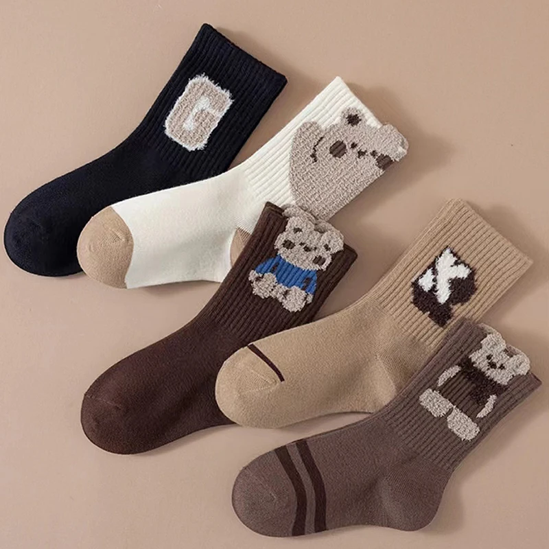 5 Pairs Cotton Cute Bear Pattern Kids Boys Mid-calf Socks Comfortable Soft Elastic Skin-friendy Cozy Socks for Children Boys