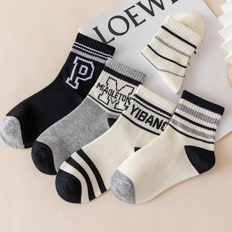 5 Pairs Letter Children Boys Sports Socks High Quility Cotton Combed Comfortable Soft Sweat Absorbing Elastic Mid-calf Kids Sock
