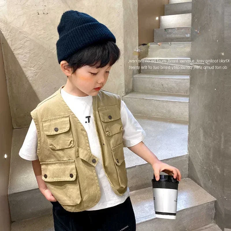 Spring Summer Boys Sleeveless Thin Jacket Coat Outdoor Cotton Vest Multi Pocket Tank Top Boys Outfit Children Clothes