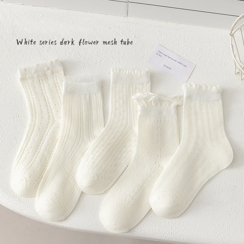 5 Pairs Color Solid Mesh Children Gils Mid-calf Socks Concise Trendy Casual Breathable Cotton Combed Cozy Soft Elastic Kids Sock