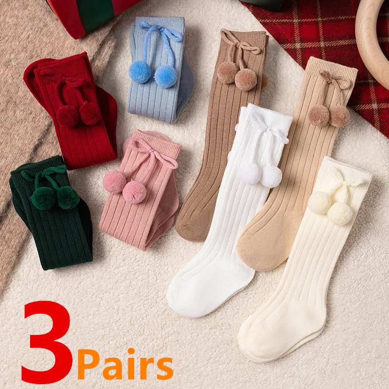 3Pairs/Lot Baby Ball Knee High Socks Soft Cotton Kids Girls Cute Stripe Solid Sock Spanish Children Long Socken For 0-8Years