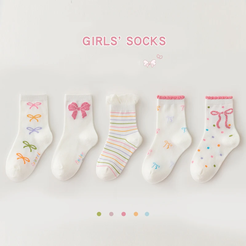 5 Pairs Bow Ties Kids Girls Mid-calf Socks Sweet Selected Combed Cotton Solid Breathable Comfortable Children's Socks for Girls