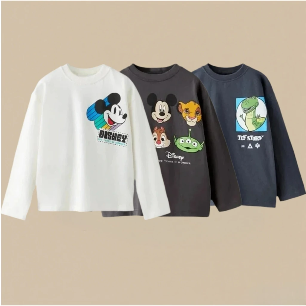 Disney Kids' Long Sleeve Tees Cartoon Print Round Neck Casual Tops For Boys And Girls Leisure Knit Cotton Clothing Spring Autumn