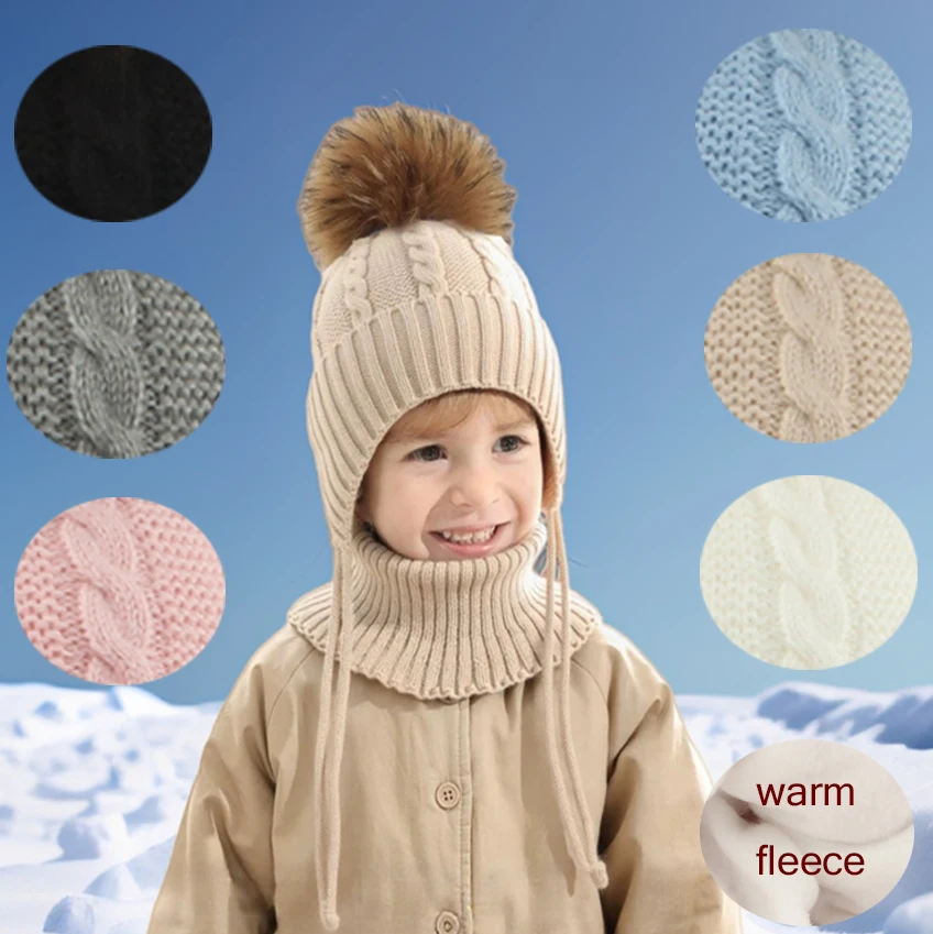 NEW Winter High Quality Knitted Wool Beanie Hat Neck Set Real Fur Ball Hat Kids Boy Girl Thick Warm Feece Outdoor Baby Cap 1-6Y