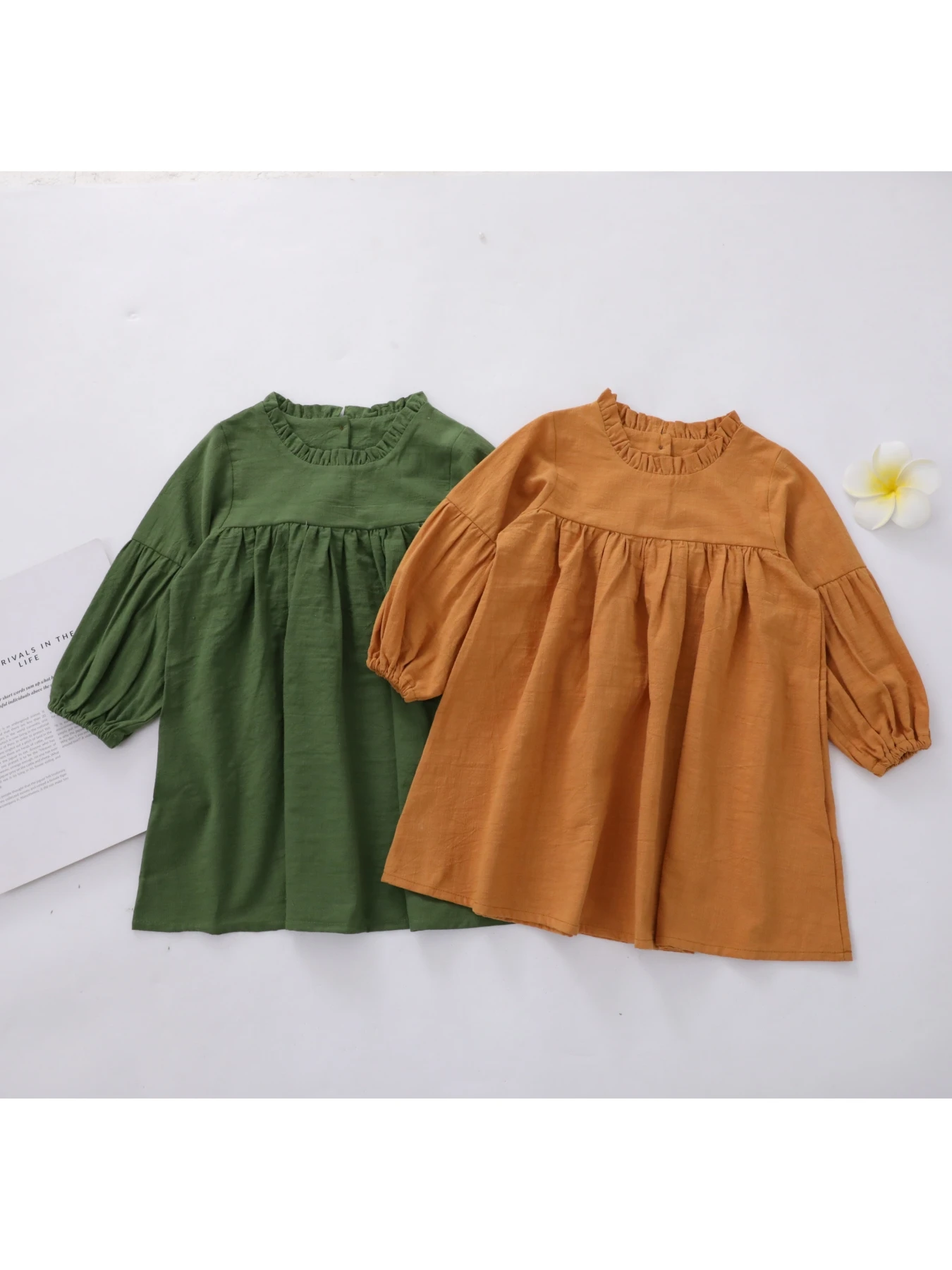 Girls' Cotton and Linen Solid Color Autumn Long Sleeve Dress Children's New Long Sleeve Jumpsuit Girls' Dress