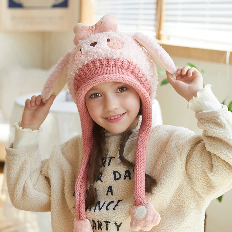Winter Cartoon Rabbit Coral Velvet Cap Plush Balaclava Kids Caps Double Fleece Baby Scarf Hat Children