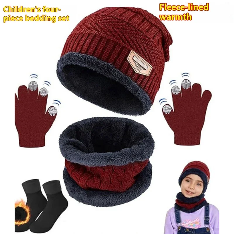 4pc Kids Winter Hat Scarf Gloves Set with Socks Warm Fleece Lined Knitted Beanie Thick Earmuffs Scarf Wholesale