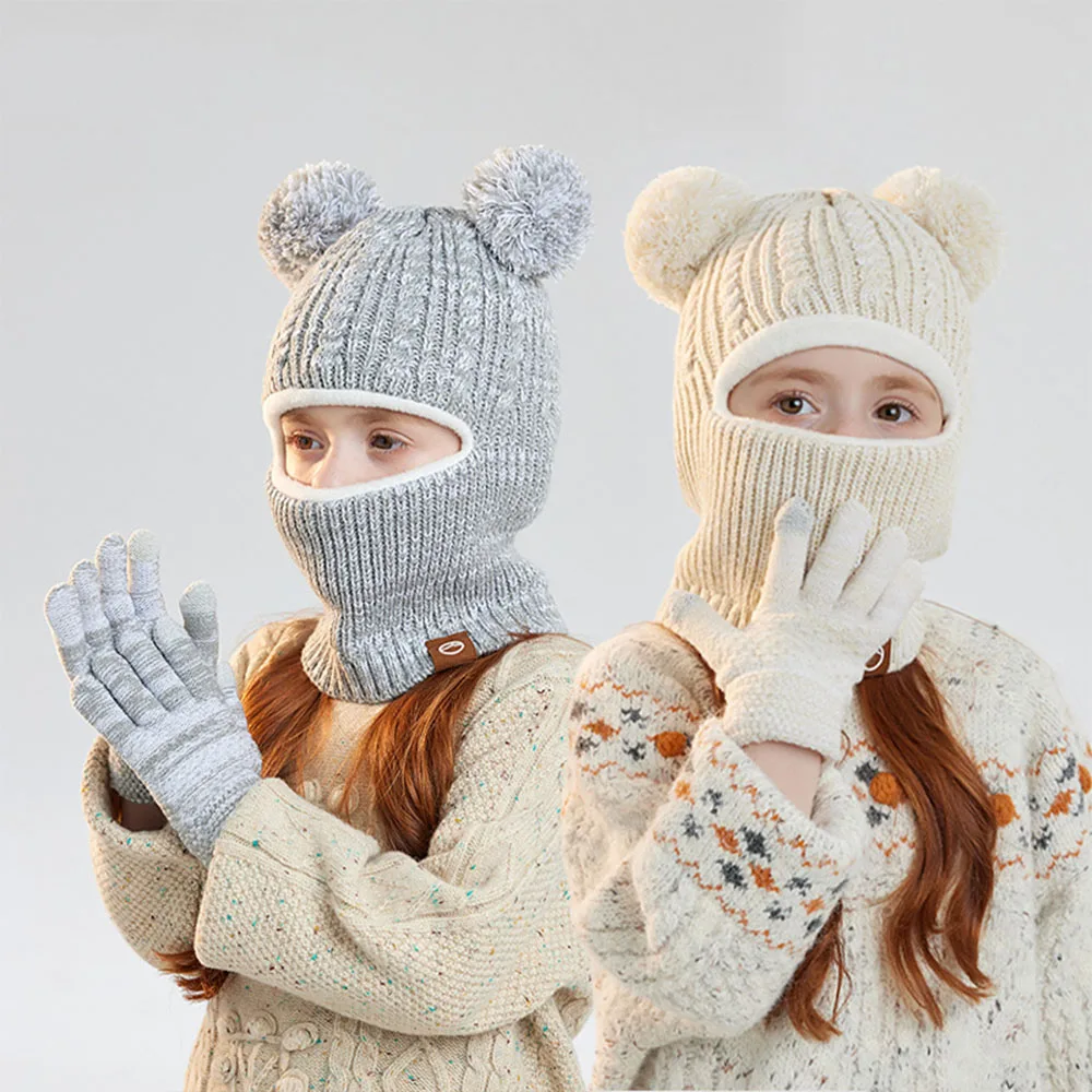 Winter Warm 2pcs Set: 4-10Y Boys and Girls One-Piece Hat, Mask & Scarf with Thick Fleece Knit Cap and a Pair of Gloves