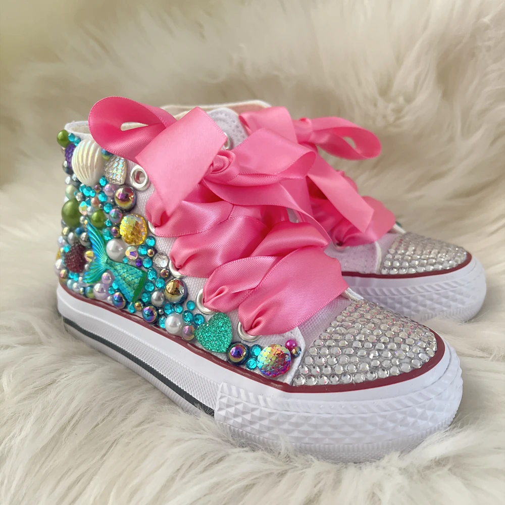 Dollbling Shell Simulation DIY Bling Handmade Shoes Canvas Mermaid Theme Kids High Top Pearls Sneakers Under the Sea Shoes  Read more