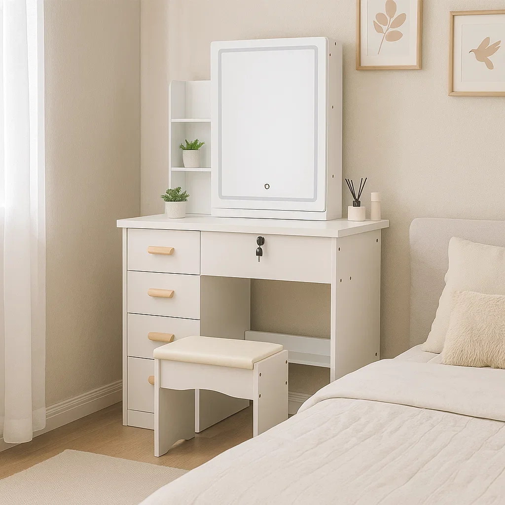 LED Mirror Vanity Table with Stool, Modern Makeup Desk with Large Capacity Drawers