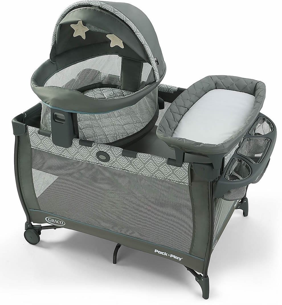 The Graco Pack 'n Play Travel Dome DLX Playard features a portable Travel Dome DLX bassinet that can be used in or out of the home, so that you can keep baby by your side anywhere. The removable bassinet features a UV 50 canopy with visor and carry...