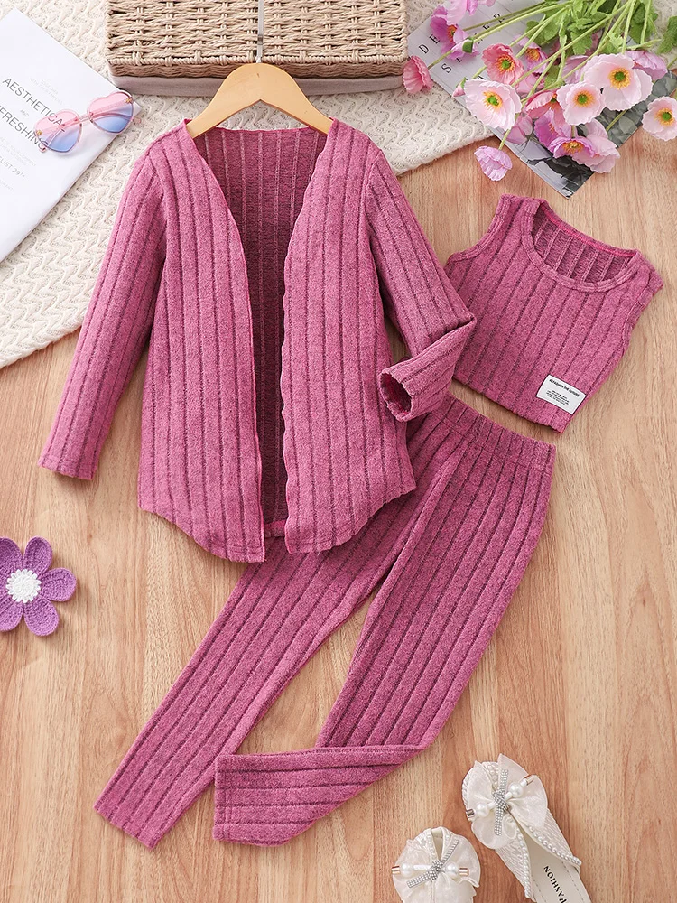 Autumn And Winter Girls' Trendy Daily Casual Sweet And Cute Knitted Long Sleeve Coat Long Pants Warm Solid Color Three Piece Set