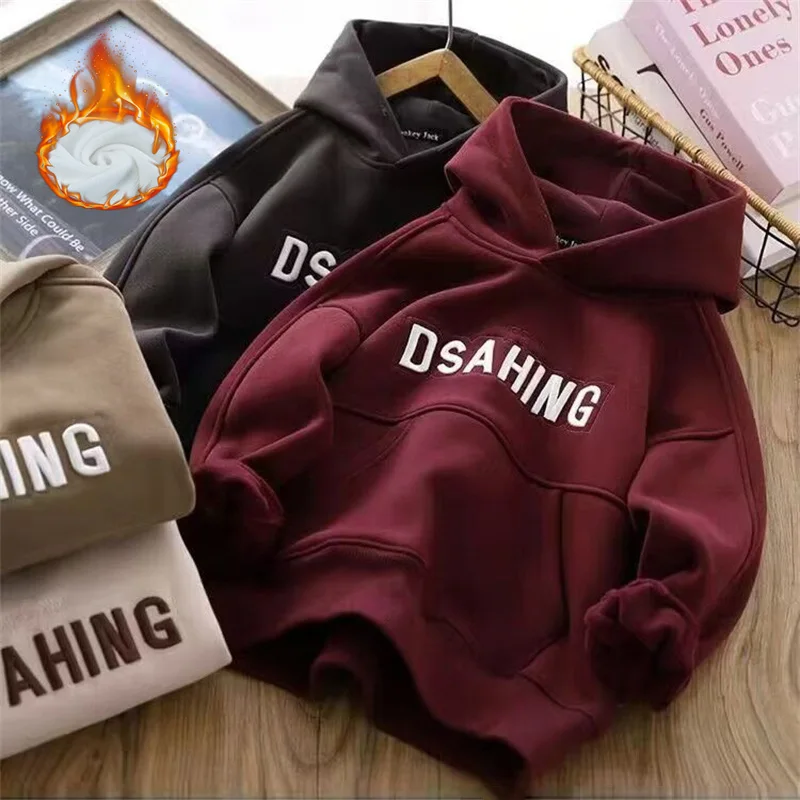 Boys Warm Thicken Hoodies Teenager Hooded Padded Sweatshirts Children Plus Velvet Tracksuit New Kids Fashion Fleece Clothing