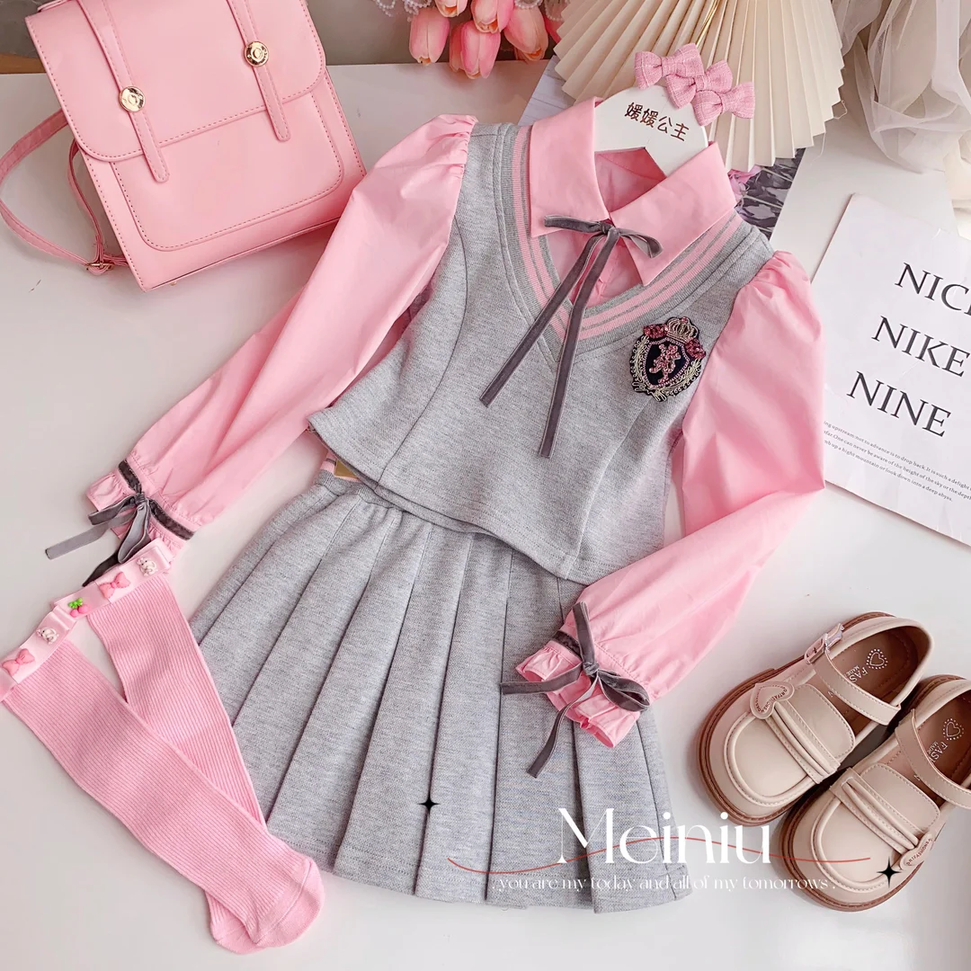 New Baby Girls Fall Teenage Sets Fake 2 Pieces Top + Pleats Skirts Princess Elegant Suits 5-12T
