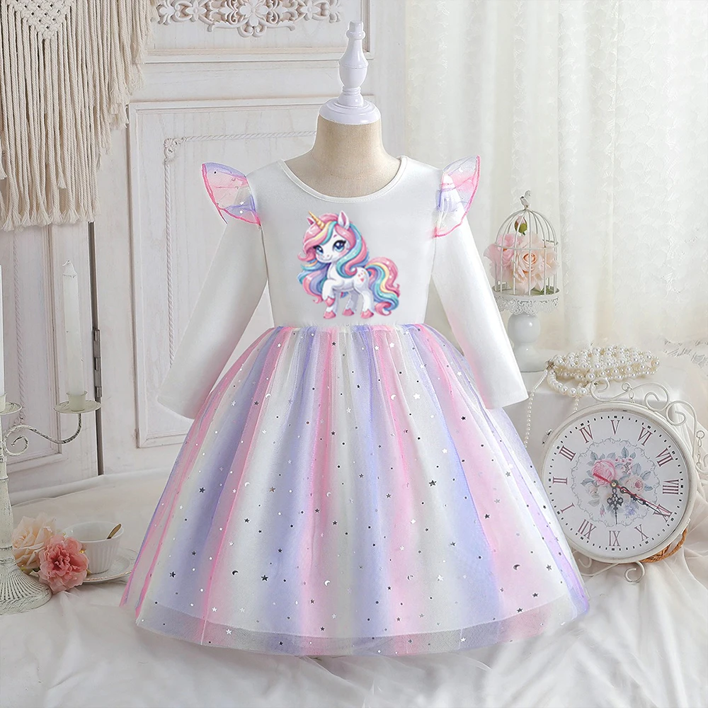 DXTON Cartoon Kids Dresses For Girls Winter Long Sleeve Princess Tulle Dress Unicorn Print Blingbling Baby Girls Casual Clothing