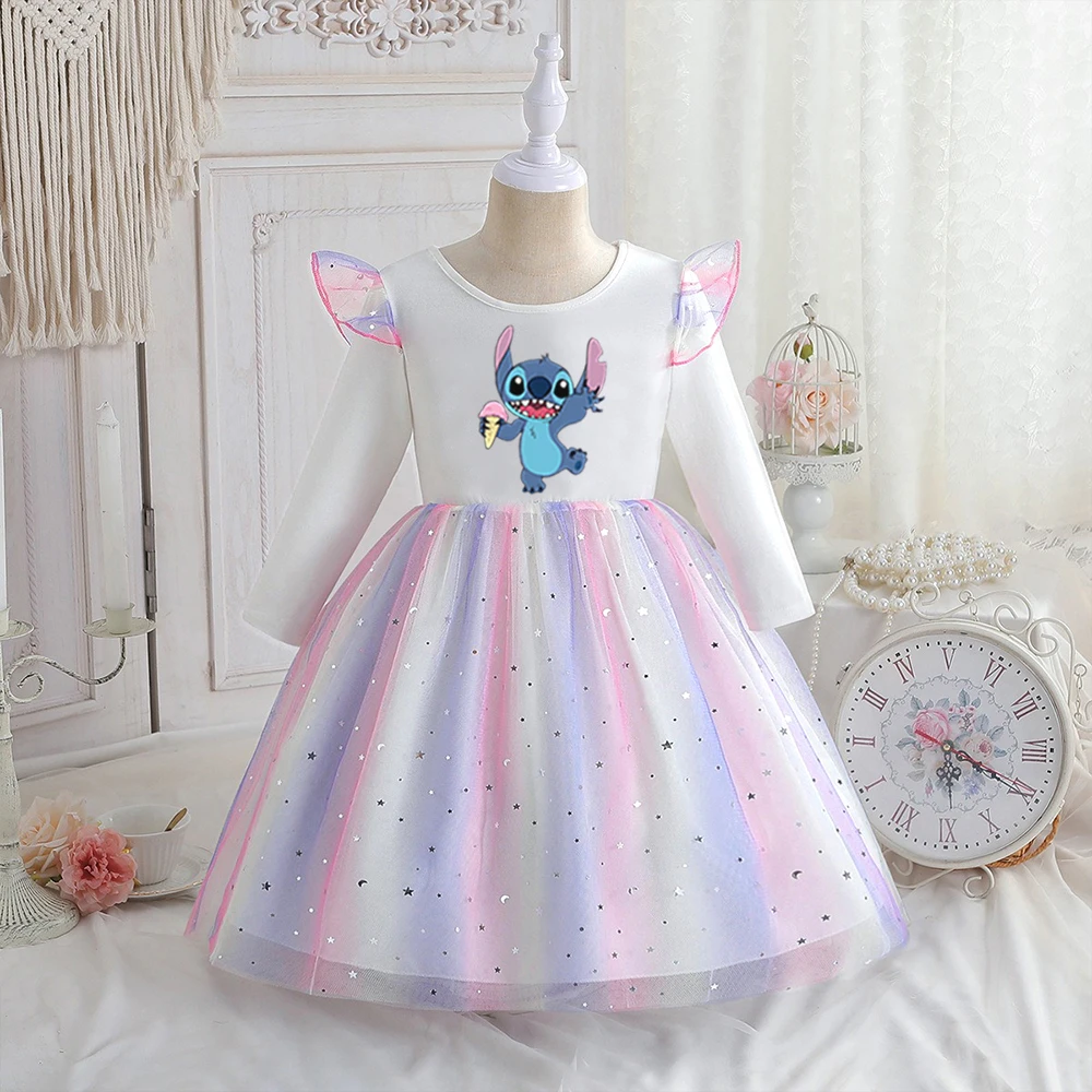 Baby Girls Dress Disney Spring Autumn New Long-sleeved Stitch Princess Dress Disney For Fashion Kids Children Birthday Party