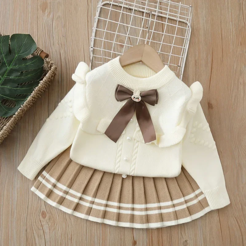 LILIGIRL 2025 Autumn New Girls Clothing Set Cartoon Bow Girls Sweater And Pleated Knit Skirt 2Pcs Girls Knit Suit Kids Outfit