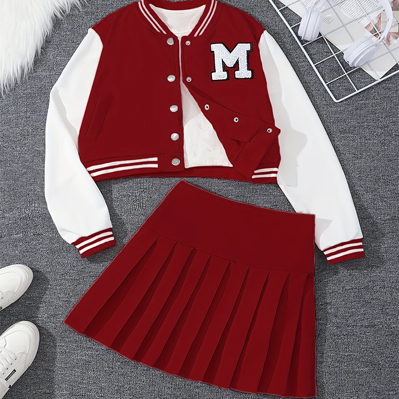 Two Piece Set Of Autumn And Winter Girls Letter Embroidery College Style Baseball Uniform Half Body Pleated Skirt Party Set