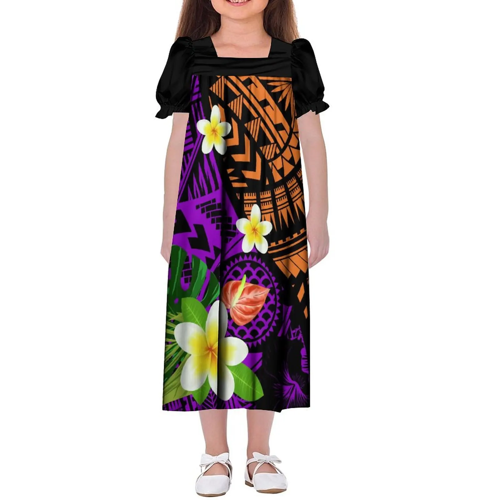 Custom Wholesale Polynesian Girls Dress Summer Puffed Sleeves Design Children'S Long Skirt Loose Dress Tribal Floral Print