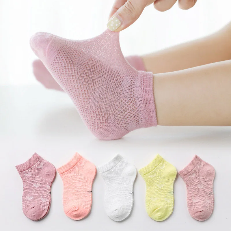 5 Pairs Girls Socks Cute Heart Pattern Mesh Breathable Soft Comfortable Baby Children Kids Ankle Socks
