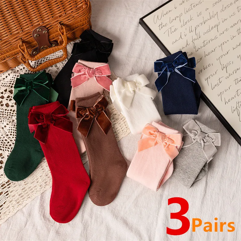 3Pairs/Lot Kids Girls Knee High Socks Baby Soft Cotton Long Sock Cute Bow Spanish Solid Children Princess Socken For 0-5Years