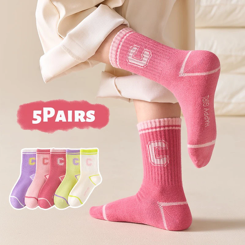 5 Pairs Children's Socks Autumn/Winter Sports Socks Middle Tube Socks Breathable Solid Color Letter Girls Sports Socks