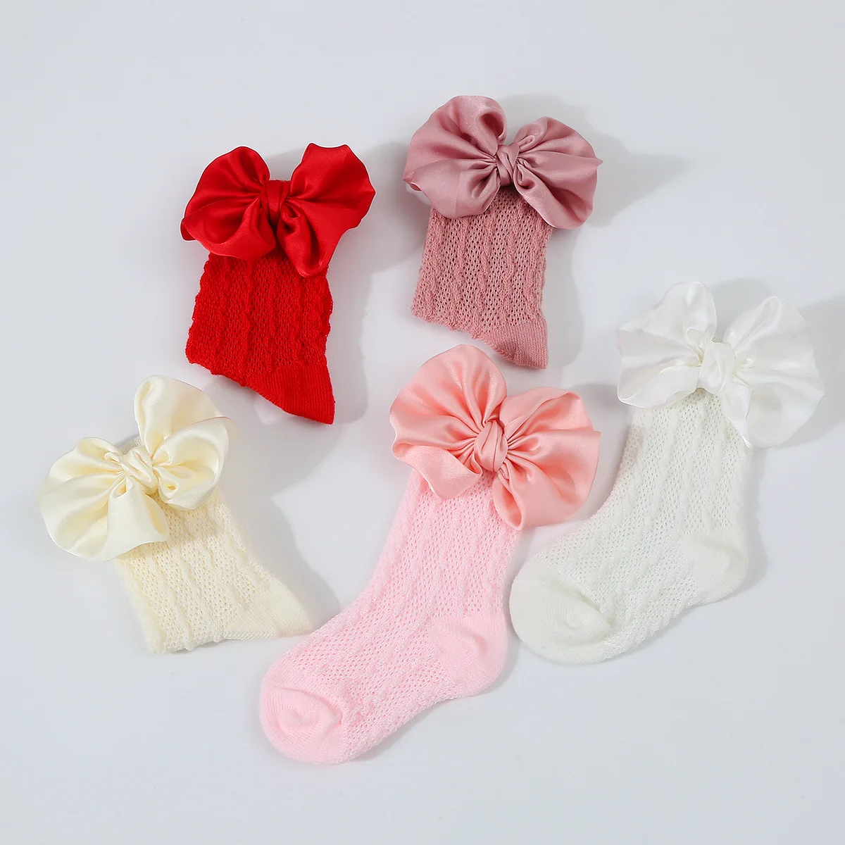 1Set Newborn Big Bowknot Headbands Hollow Out Long Socks New Baby Soft Solid Prewalker Sock Girl Infant Knitted Hairband Socks