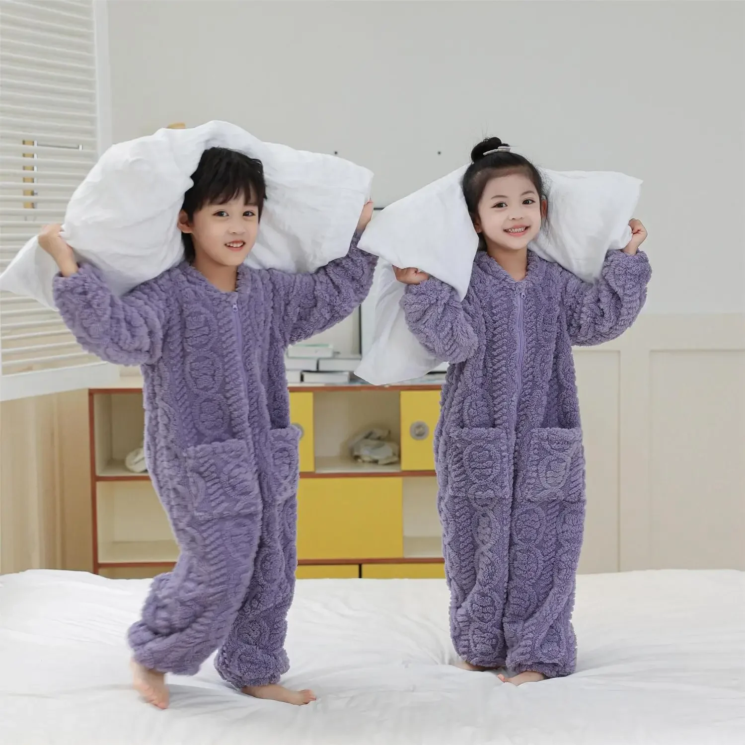 Children's Sleeping Jumpsuit One-piece Pajamas Girls' Winter Thick Boys' Parent-child Flannel Coral Fleece Home Clothes for Baby