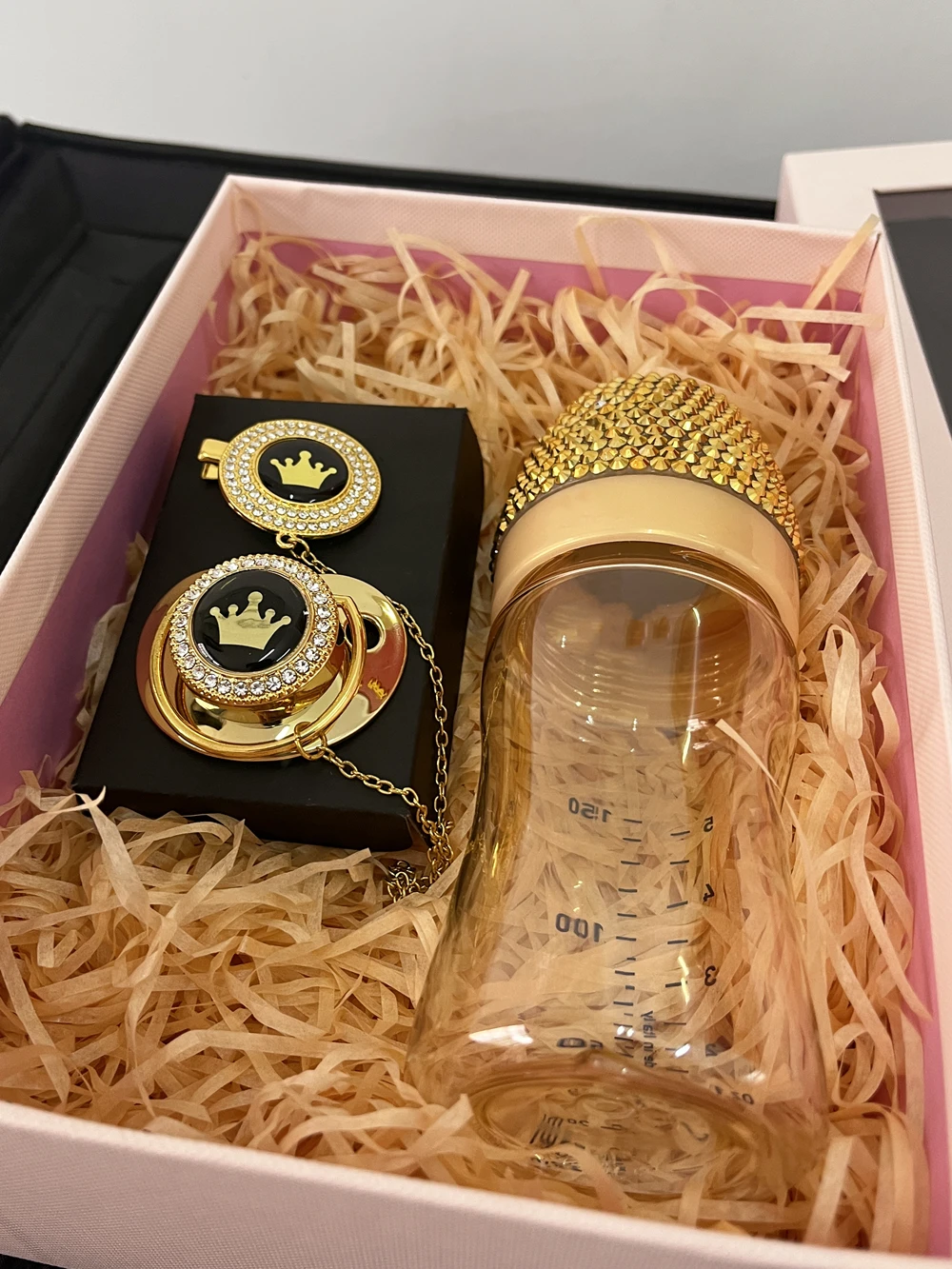 Dollbling Handmade Crystal Gold Baby Bottle and Pacifier Clips Set 0-6m Infant Girl Newborn Angle Wing Crown Nursery Decoration