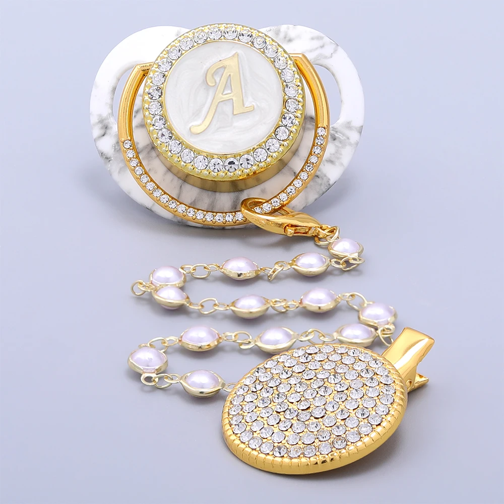 Personalised Pacifier Beads Bling Gold Pacifier Holder BPA Free Silicone Nipple 24 Letter Name Newborn Dummy Soother Chupete