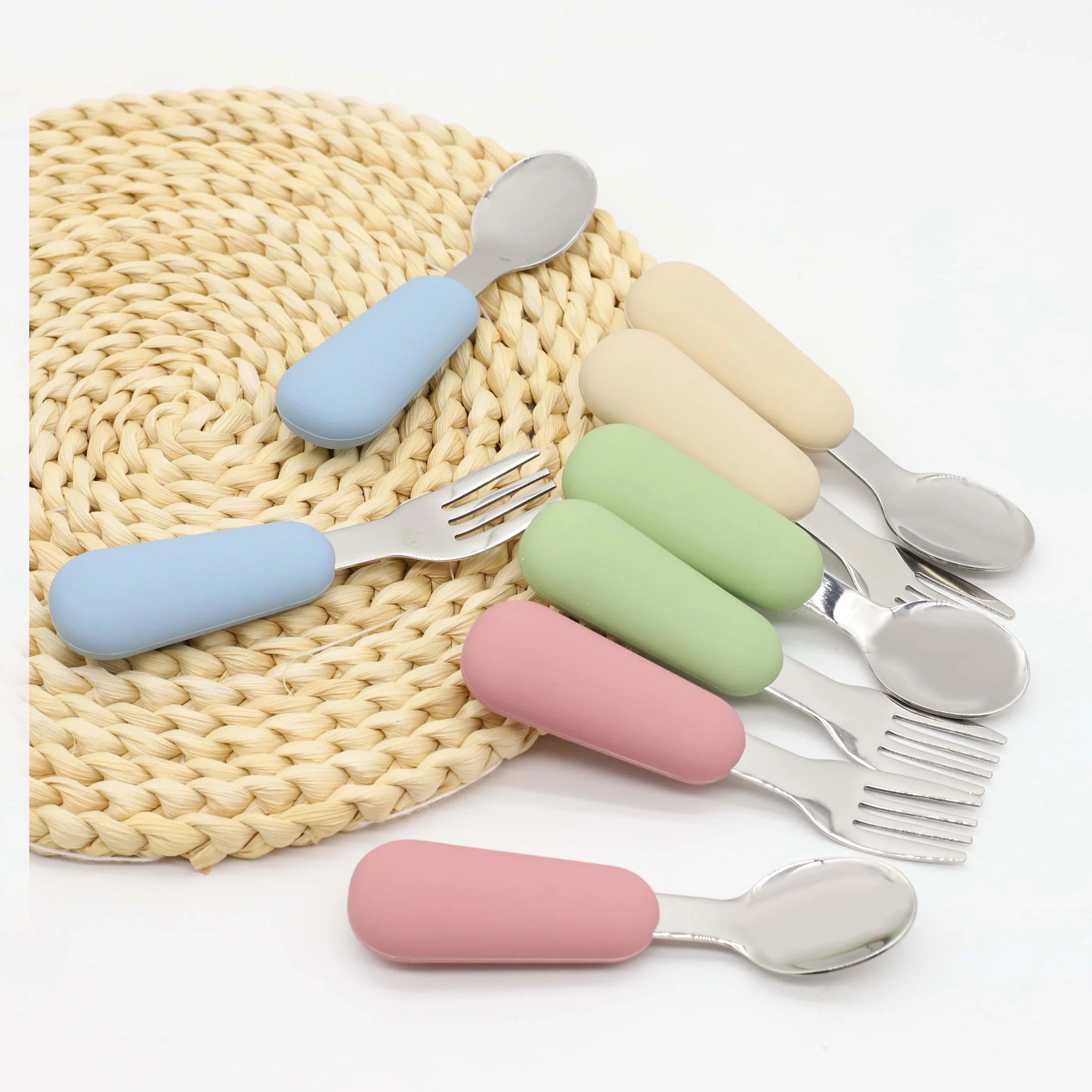 Silicone stainless steel spoon fork food grade 304 stainless steel easy to grip silicone handle baby food feeding spoon fork