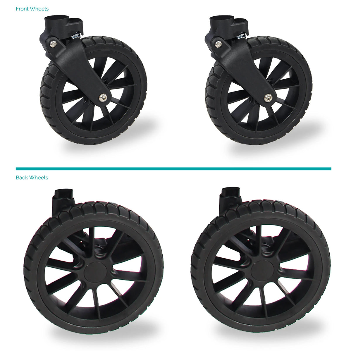 Fits on the W4 stroller wagon model. Great to navigate through various terrains.Key Features: Extra large stylish rims; All terrain PU tires; It fits W4 model only; Easy to install; No pumping required; Dimensions: 10" front wheels and 12? rear...  Read more