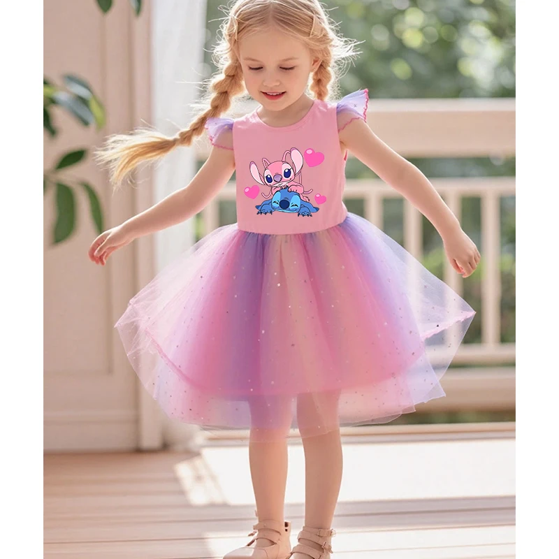 Stitch Toddler Girl Tulle Dress Summer Ruffle Sleeveless Baby Girl Fashion Casual Princess Cute Dress Kid Birthday Gift Clothes